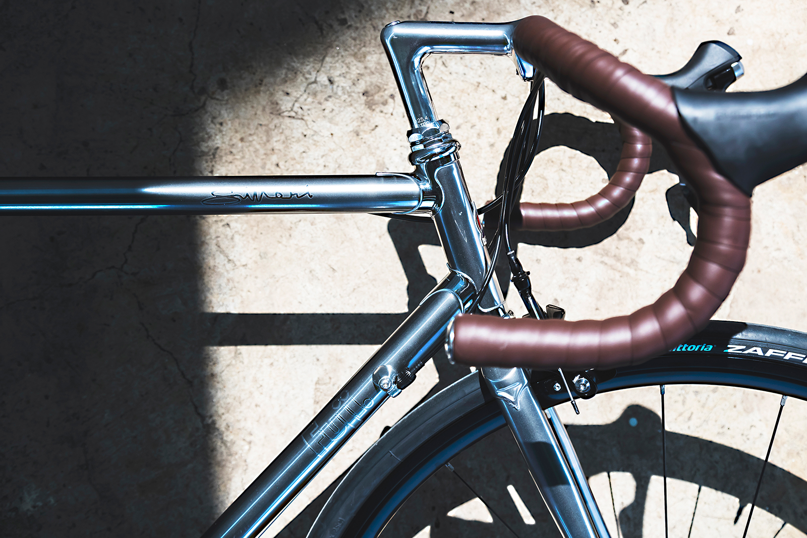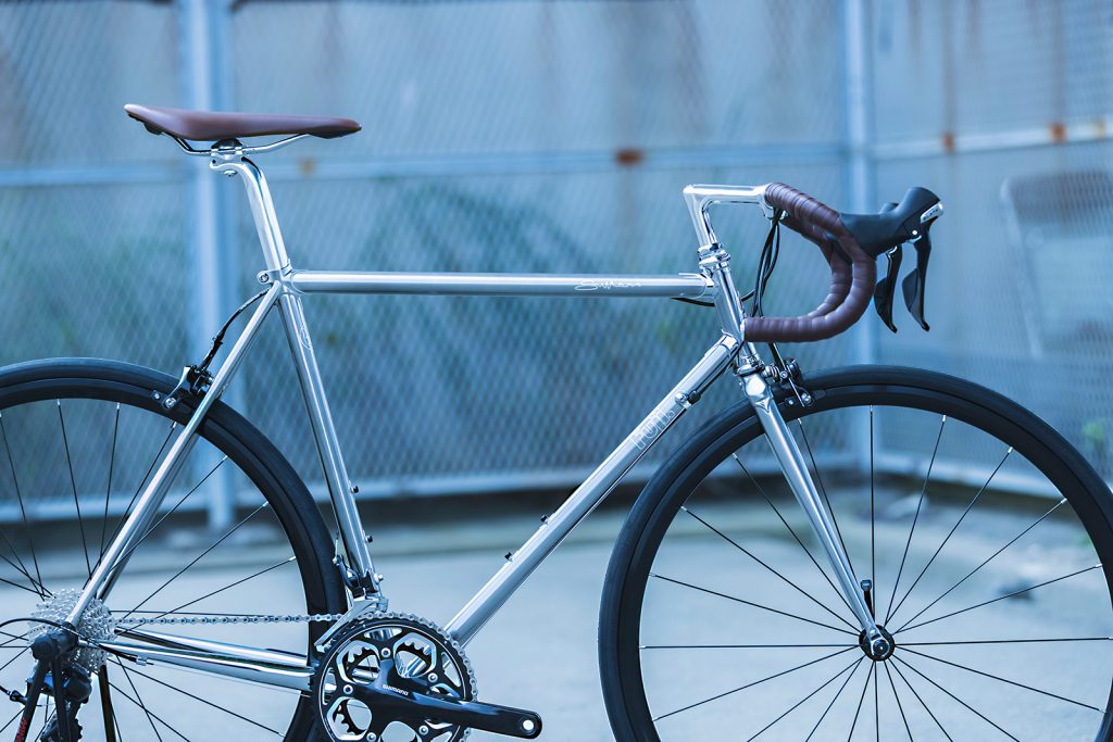 レイノルズ525バテッドクロモリパイプをクラシカルなラグで繋ぎ、右チェーンステーやヘッドラグに施されたメッキ処理の美しさ・アクセントがこのシンプルなホリゾンタルフレームの佇まいに際立ちます。