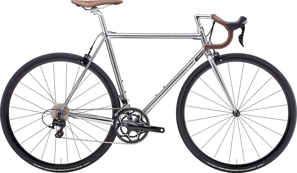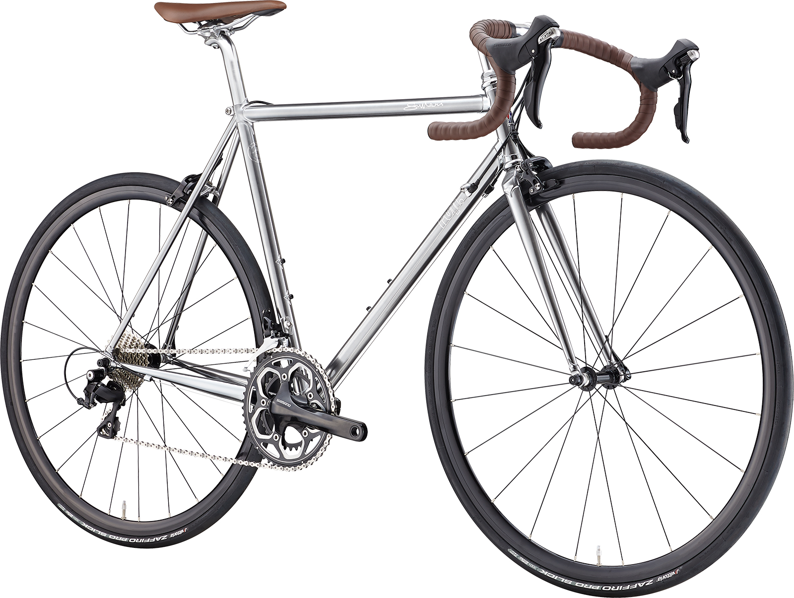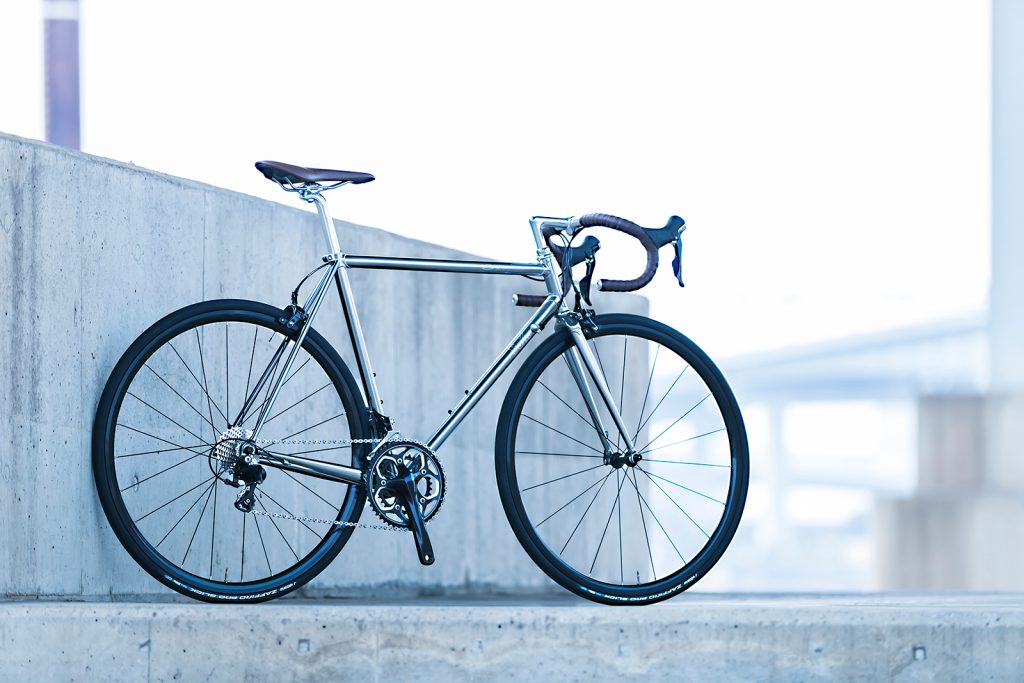 ストレートフォークにブレーキワイヤー内蔵フレームに、メインコンポーネント:Shimano 105 2x11SPEED、オールブラックの軽量ホイールと現代的なパーツ構成と、トラディショナルなドロップハンドルやスレッドステムなどのシルバーパーツの組み合わせは、絶妙なバランスがとれたまさしくネオクラシックと呼ぶにふさわしい一台。