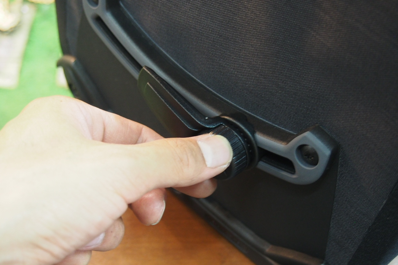 メインのパニアラインナップにはオリジナルのQL2.1というシステムを採用。バッグの持ち手をグイッと上にあげるだけで、フックの部分が自動に開閉するシステム、キャリアのレール部へのと脱着がとても簡単に行えます。