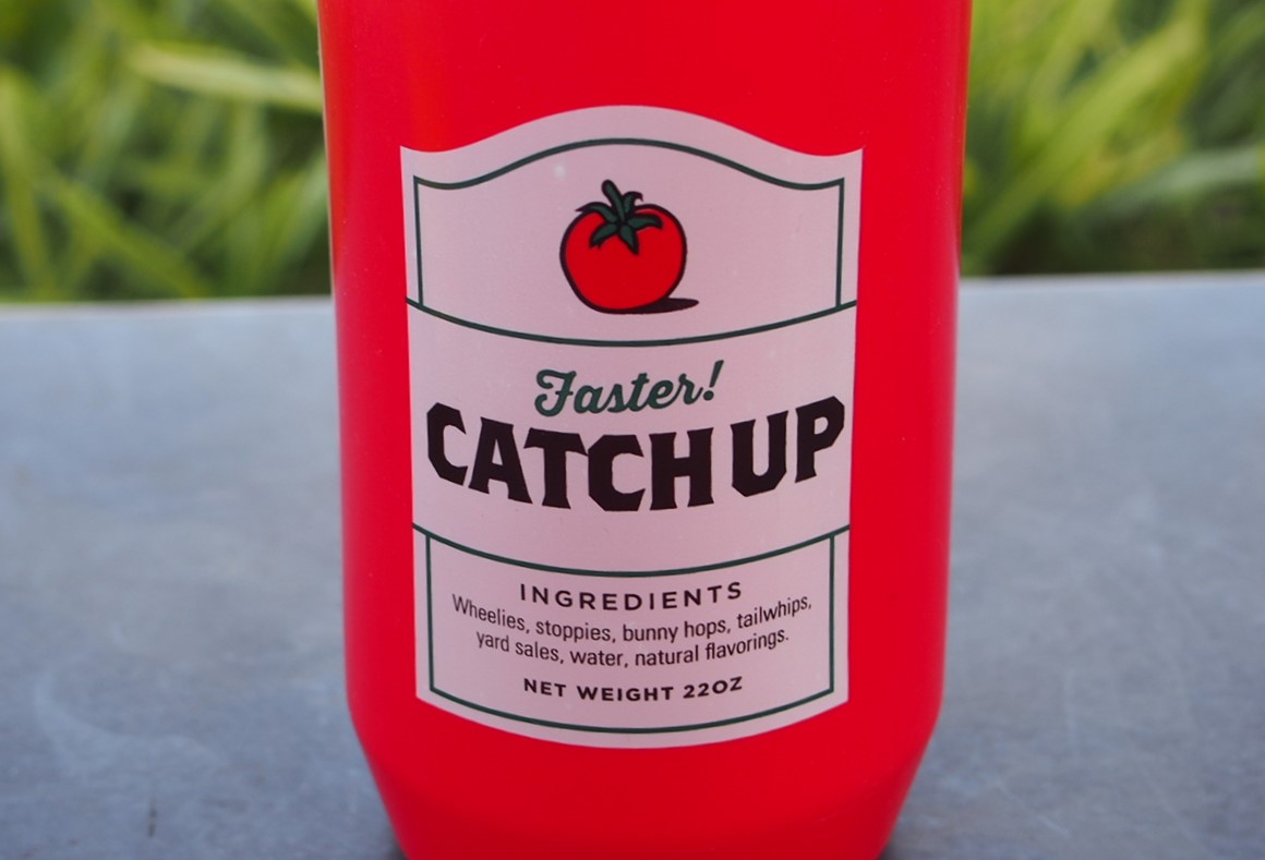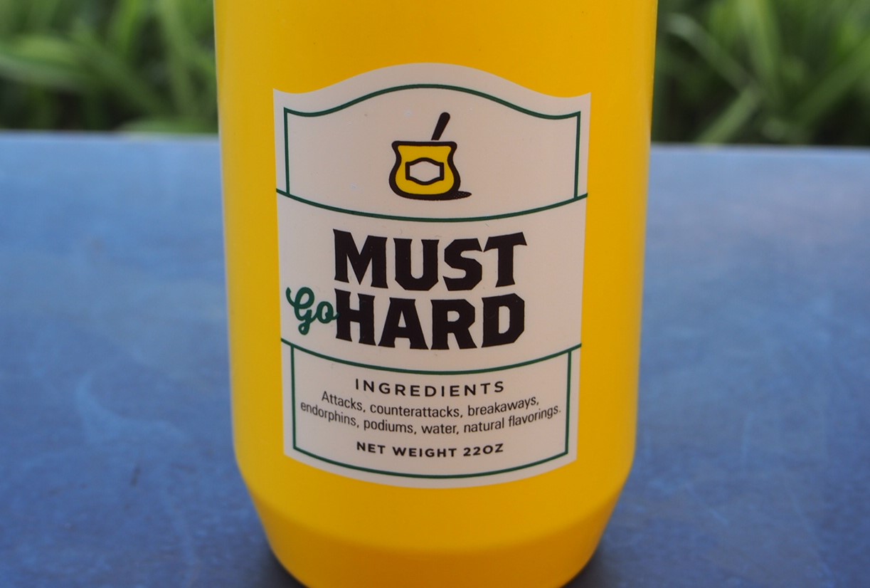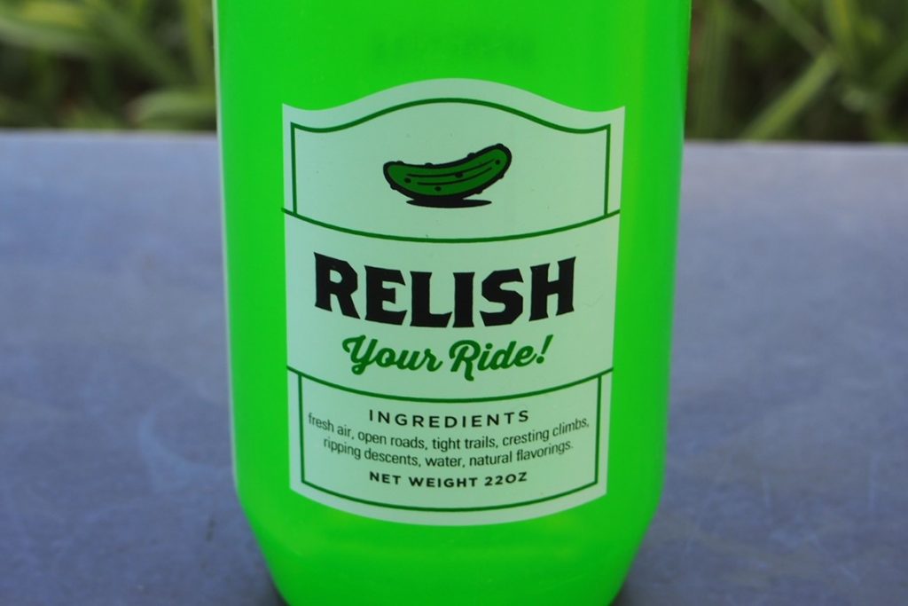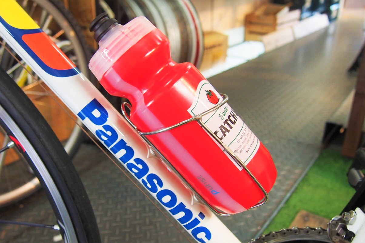 赤、黄、緑のカラーリングが、”ホットドッグ”にまつわる語呂合わせのデザインとなっております、”脱力系”サイクリングボトル。