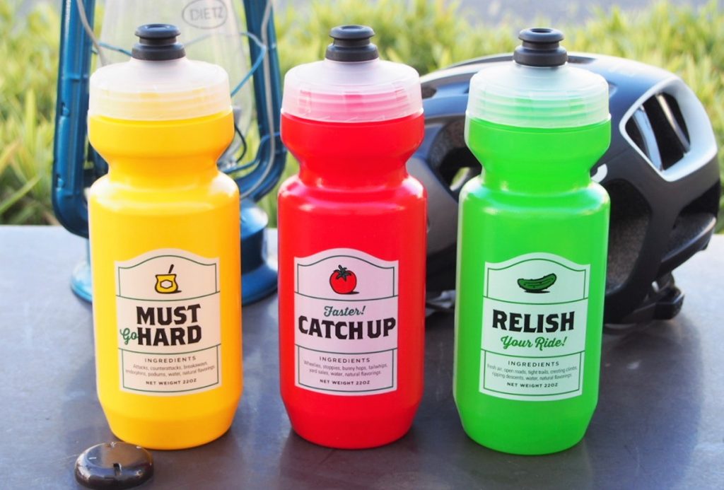 ホットドッグにまつわる、ケチャップ、マスタードそしてレリッシュ(ピクルス)のチューブボトルをイメージしたシャレの効いた”ウォーターボトル”