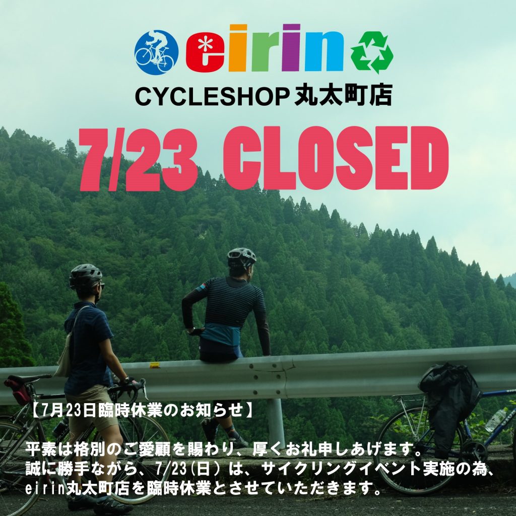 さて、誠に勝手ながら、7月23日(日)におきまして、サイクリングイベント実施の為、eirin丸太町店を臨時休業とさせていただきます。