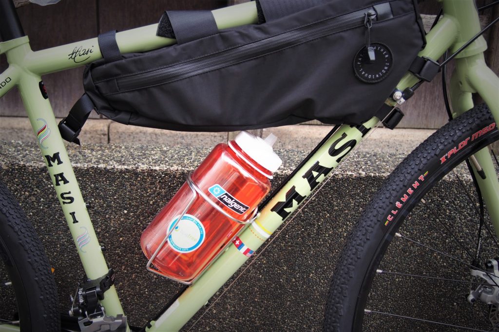 そのおかげでボトルゲージ位置を下方向へ取り付ける事が可能となり、上の画像にあるように大きなナルゲンボトルでもフレームバッグとの干渉を回避します。