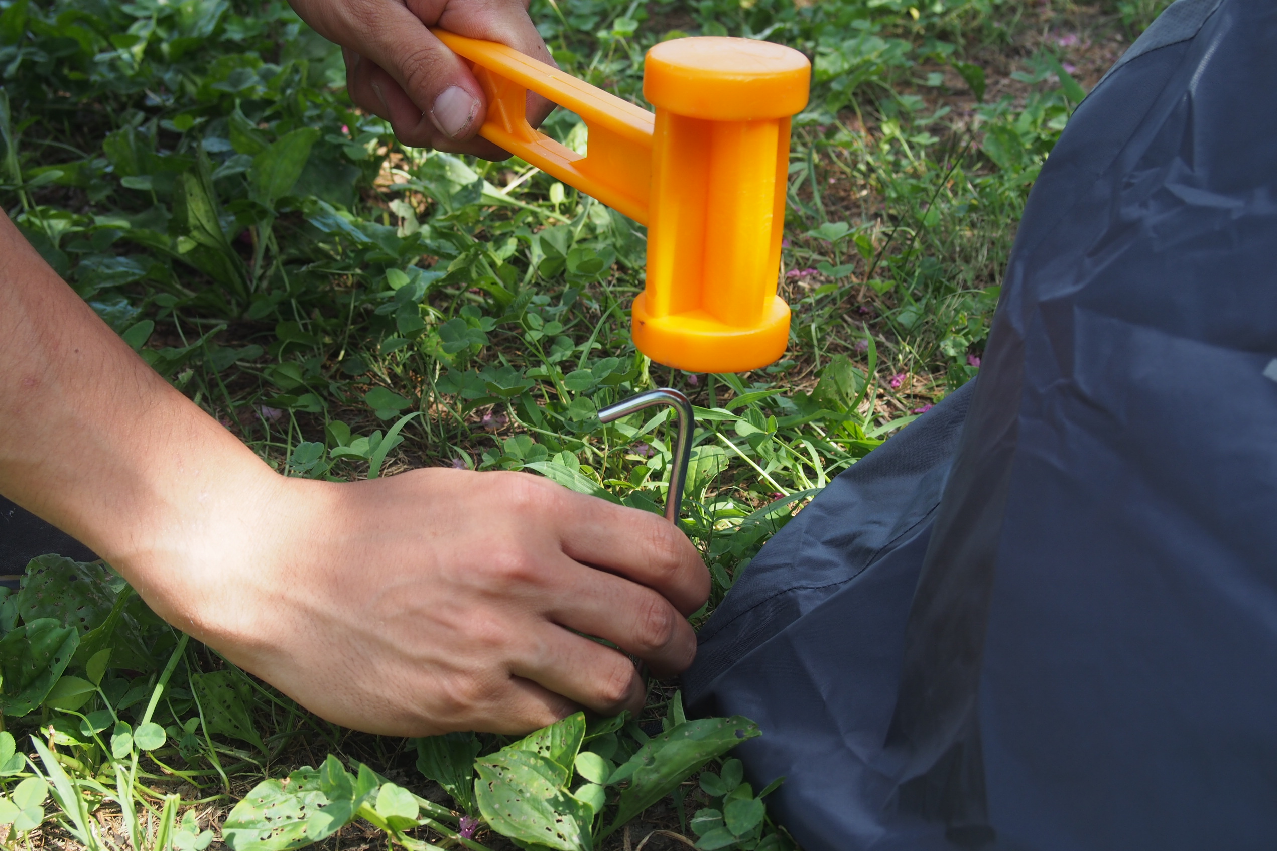 標準で付属されるポールを通すことで頭部分は半自立し、また上部に配されたループにロープを通し木の枝などから吊るすことでより安定します。