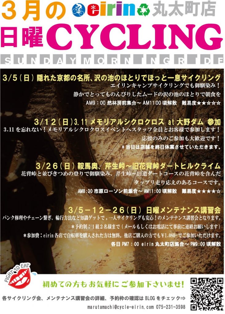 *参加費:eirin各店で自転車を購入された方は無料。他店ご購入の方でも¥1.080-でご参加いただけます。
