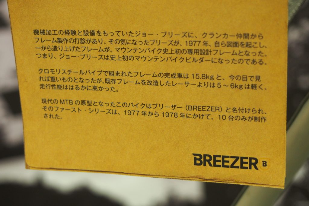 (上画像の自転車が世界初のマウンテンバイクとなった ”BREEZER”。計10本制作され、そのうちの一台は大阪の自転車博物館に展示されております)