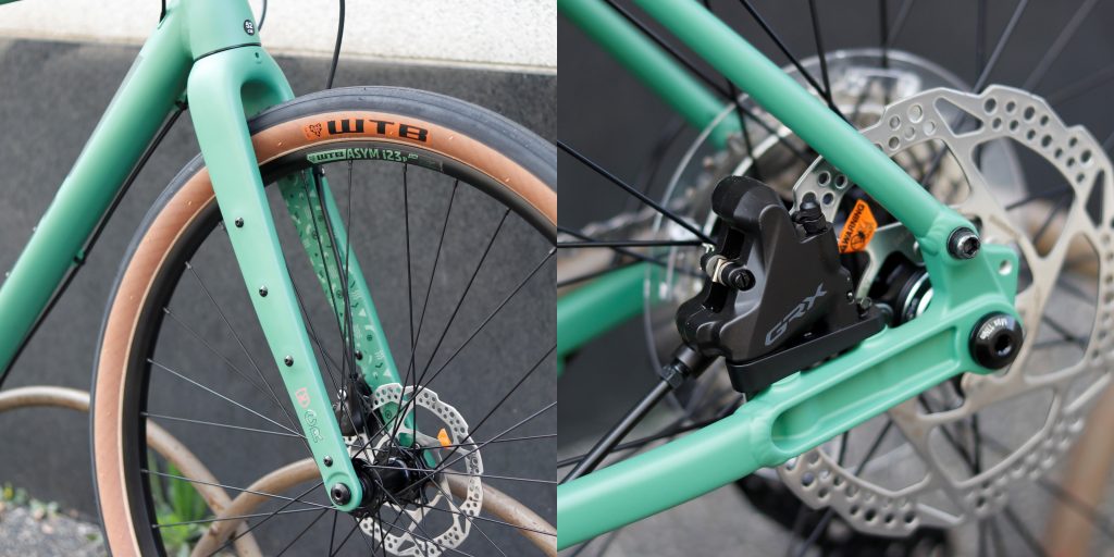 レイノルズ520スチールチューブにフルカーボンフォーク。シマノGRX 2x10SPEED 油圧ディスクブレーキコンポーネント採用。