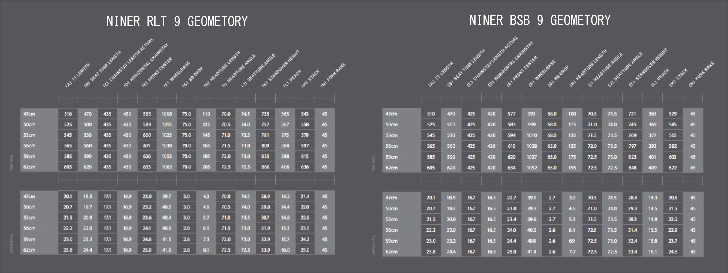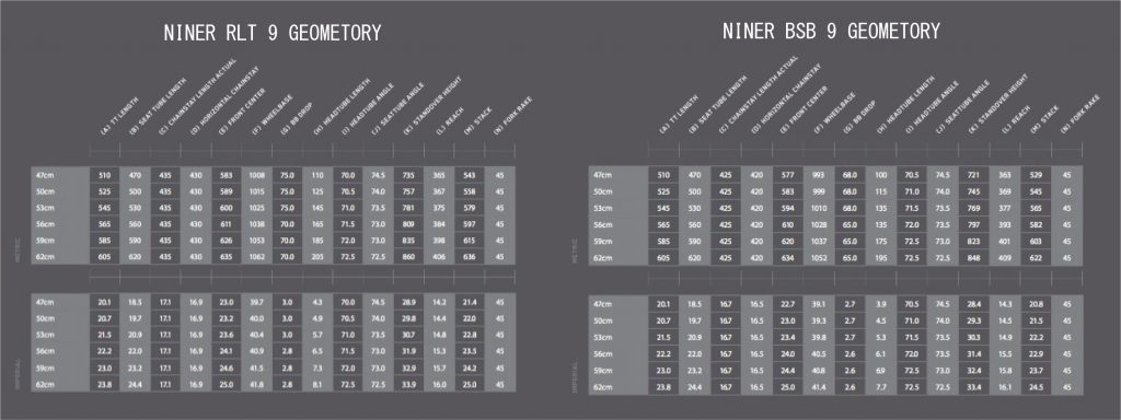 上記表は、装着タイヤ幅がほぼ同じのグラベルロード(RLT9)とシクロクロス(BSB9)の二種をラインナップする数少ないブランド、NINERBIKES(*2017モデル時)のもの。